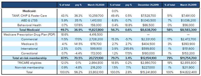 Medicaid est la plus grande division de Centene avec près de 12 millions de membres, ce qui lui confère la plus grande part de marché au niveau national et la première place parmi les quatre plus grands marchés Medicaid de l’État. En 2019, Centene a augmenté les revenus de Medicaid de 28 %, pour atteindre 50,4 milliards de dollars, soit environ 67 % de l’ensemble des revenus en 2019.