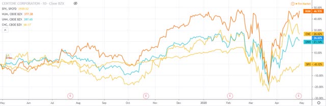 Comme le montre le graphique ci-dessus, l’action Centene a gagné 26 % au cours de l’année dernière, surpassant le S&P 500, ce qui correspond globalement aux performances de United Health (UNH), un autre assureur santé, mais est loin derrière Humana (HUM) qui a gagné 21 % et 47 % respectivement. On constate également que le secteur de l’assurance maladie s’est très fortement remis de la crise des coronavirus et est actuellement très dynamique.