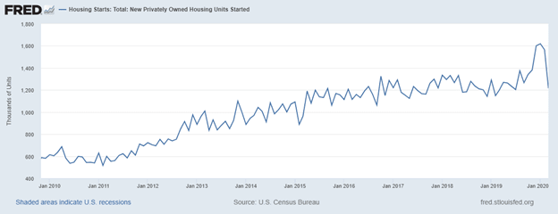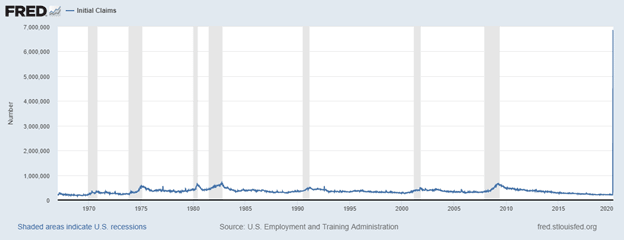 Les demandes initiales de chômage ont de nouveau dépassé les estimations du consensus pour la quatrième semaine consécutive, portant le nombre total de demandes de chômage à plus de 20 millions en un mois. Ce graphique est tellement inédit qu’il est difficile à croire. La ligne bleue verticale à l’extrême droite n’inclut pas les 5,25 millions de demandes de chômage supplémentaires publiées dans les données du 16 avril. Elle est encore plus élevée maintenant.