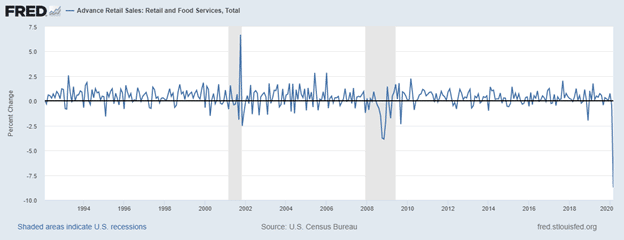 En commençant par les ventes au détail, le mois de mars a connu la plus forte baisse des ventes au détail de l’histoire, avec un recul mensuel de 8,7 %. C’est la première surprise de la semaine, car on s’attendait à une baisse de seulement 8 %.