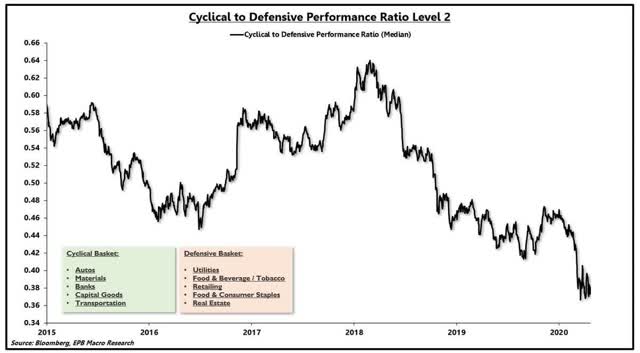 2. Cycliques vs. défensifs : On peut dire que ce tableau montre la bataille entre la stimulation et la distanciation sociale. Une fois de plus, malgré le rebond important du S&P 500 au cours du mois dernier, le rapport entre les actions cycliques et les actions défensives oscille près du creux de la vague. Dans des circonstances normales, cela représenterait un manque de confirmation. Les investisseurs sont encore aigris par rapport aux secteurs sensibles à la faiblesse des dépenses de consommation et à ceux qui dépendent du mouvement physique. Au sein des titres défensifs, les actions du secteur de l’alimentation et des boissons ont été mitigées, mais l’espace des épiceries défensives reste un havre de sécurité.