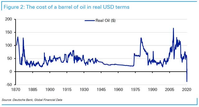 Alors que les données de l’EIA ne remontent qu’au début des années 1980, la Deutsche Bank a fait une étude pour trouver les prix du pétrole depuis 1870. Ils ont mis le graphique des prix en termes réels. En dollars de 2020, 20 dollars correspondaient à peu près au plancher sur une période de 150 ans. Ce n’est plus le cas aujourd’hui. Du pic au creux, il a chuté de 200 dollars sur une base corrigée de l’inflation, depuis le pic de juillet 2008.