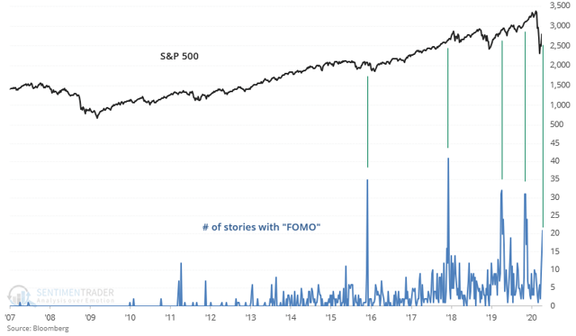 5. Le FOMO en plein essor : Troy Bombardia fournit ce look du S&P 500 avec des reportages mentionnant « FOMO ». La croissance des grandes capitalisations continue de progresser. Toujours la même histoire. Il y a eu un pic ces derniers temps dans les articles mentionnant la peur de manquer, « FOMO ».