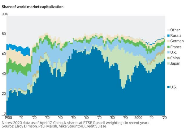 10. Actions mondiales : Adam Tooze fournit ce regard sur la contribution des pays au plafonnement du marché mondial. Les États-Unis ne sont pas les seuls à jouer le jeu, mais ils restent de loin le plus important. La part américaine de la capitalisation boursière mondiale a dépassé le pic de 2000 et s’est rapprochée de la fourchette qui a suivi la Seconde Guerre mondiale et avant la période de volatilité des marchés des années 1970 et du début des années 1980.