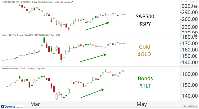 3. Actions, obligations et or : Celui-ci de notre ami J.C. à Allstarcharts. Une cascade de liquidités a contribué à propulser la plupart des actifs à une forte hausse au cours des cinq dernières semaines. Nous sommes de grands fans de l’analyse inter-marchés, et il est toujours révélateur que tout bouge ensemble. Les actions ont augmenté comme nous l’avons dit, mais l’or et les titres du Trésor à long terme ont également augmenté.