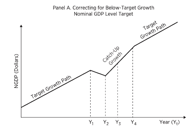 Mon dernier point est que le véritable changement demandé est l’adoption d’un objectif de niveau. Autrement dit, l’objectif est de faire passer la Banque d’Angleterre d’un objectif de taux de croissance NGDP implicite à un objectif de niveau NGDP explicite. Cela obligerait la banque centrale à compenser les manquements passés par rapport à sa cible. Autrement dit, un objectif au niveau du NGDP permettrait à la banque centrale de gérer temporairement l’économie à chaud jusqu’à ce que le NGDP reprenne sa trajectoire de croissance tendancielle. Dans le cas du Royaume-Uni, cela signifie une croissance du NGDP plus rapide que le taux de croissance tendanciel de 4%. Cette croissance de rattrapage plus rapide que la normale est parfois appelée politique de «rattrapage» et est illustrée ci-dessous: