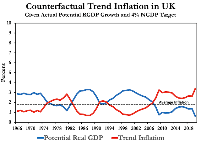 Si le Trésor britannique devait annoncer un objectif de niveau NGDP pour la Banque d’Angleterre, cela pourrait être aussi simple que de restaurer le NGDP sur sa trajectoire de croissance tendancielle qui existait sous Mark Carney. Autrement dit, exécuter temporairement le NGDP à chaud pour compenser les déficits inférieurs à sa trajectoire de tendance qui s’est produite pendant la crise du COVID-19. Après cela, augmentez simplement le NGDP à 4%. Comme le montre le premier graphique, un objectif de 4% serait probablement acceptable compte tenu des changements probables du PIB réel potentiel au Royaume-Uni. Des versions plus compliquées d’une cible de niveau NGDP sont possibles, mais je commencerais simplement.