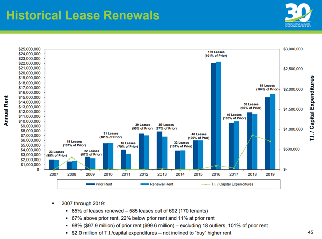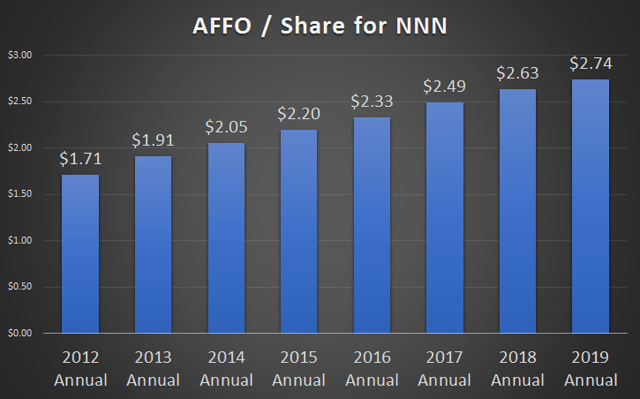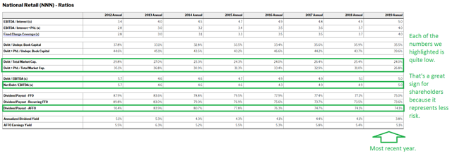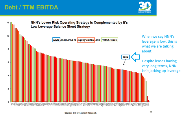 Par rapport à l’univers des sociétés de placement immobilier en Amérique, NNN était plutôt faible en termes d’endettement. La combinaison de baux à long terme avec un faible effet de levier est une excellente combinaison pour la stabilité.