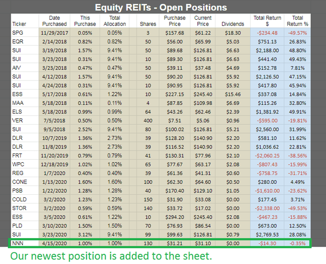 - Nous avons ajouté 130 actions de NNN à notre portefeuille, à 31,21 dollars par action. Cette position représente environ 1 % de notre portefeuille total.
