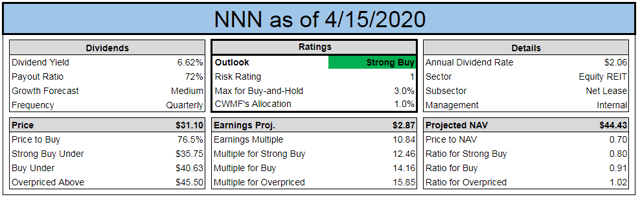 NNN est l’une des sociétés de placement immobilier qui, selon nous, conviendra très bien aux investisseurs de type buy-and-hold. Les actions ont une note de risque de 1. Leur dividende est solidement couvert, malgré un fort rendement de 6,62 %. Nous prévoyons que la croissance du dividende se poursuivra à un rythme moyen dans un avenir prévisible, bien qu’ils puissent choisir d’utiliser un rythme plus lent à court terme en fonction de la gravité de la pandémie. Ce type de vente a été extrêmement inhabituel sur les FPI à triple bail net de haute qualité, nous en profitons donc. Avant cette pandémie, nous n’avions pas vu une remise aussi importante depuis la Grande Récession.