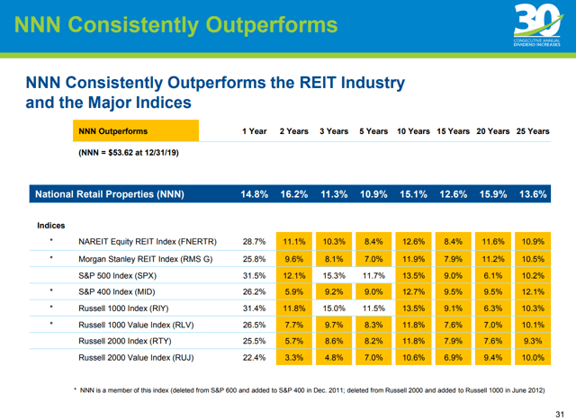 La simple stratégie de croissance constante de l’AFFO par action a permis à NNN de surpasser considérablement la plupart des grands indices. Que ces indices soient basés sur des REIT ou d’autres indices boursiers, NNN a gagné la plupart du temps :