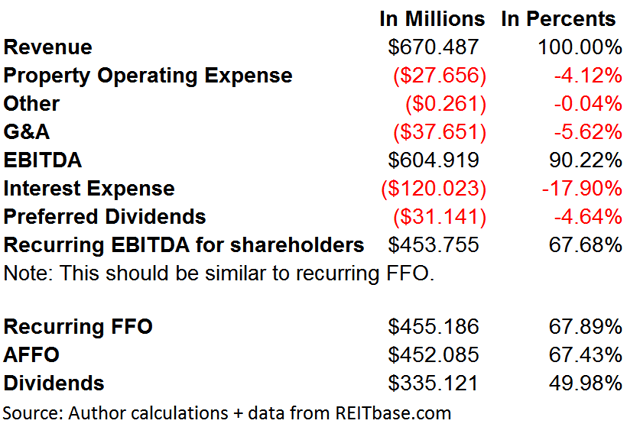 Afin de démontrer pourquoi NNN ne serait pas « forcée » à effectuer une mauvaise transaction, nous voulons mettre en évidence la manière dont les liquidités transitent par le FPI. Nous le faisons en simplifiant le compte de résultat dans un format qui sera beaucoup plus facile à comprendre pour les investisseurs. Ensuite, nous indiquons les valeurs en dollars et en pourcentages :