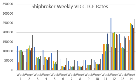 Il est évident que la plus grande variabilité se situe au niveau des taux d’affrètement des VLCC. En effet, il y a moins de ports pouvant accueillir des VLCC dans le monde entier. Ces mêmes ports sont accessibles aux pétroliers Suezmax et Aframax. Cela a en fait augmenté la demande pour les petits pétroliers et a contribué à réduire la variabilité des prix.