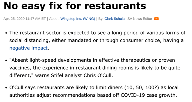 À moins que vous n’exploitiez une marque qui était déjà et reste pour ainsi dire une habitude quotidienne pendant cette pandémie (voir Starbucks), que le service au volant ne soit une composante majeure de votre modèle commercial (voir McDonald’s), que vous ne soyez connu avant tout pour la livraison (voir Domino’s Pizza) ou que vous ne soyez fait pour le grab-n-go et Si vous êtes obsédé par la sécurité alimentaire (voir les produits rapides comme le Chipotle), vous allez avoir du mal à passer à un modèle de livraison seule ou même de livraison/ramassage seul. Une majorité écrasante de chaînes de restaurants nationales qui attendent simplement l’appel pour rouvrir et faire des affaires comme d’habitude pourraient bien se réveiller à nouveau.