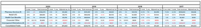 Comme nous pouvons le voir dans le tableau ci-dessus, alors que les services de pharmacie génèrent la majorité des revenus de CVS – 141 milliards de dollars en 2019, un chiffre qui, selon les prévisions de la société, devrait tomber à environ 138 milliards de dollars en 2020 – c’est en fait le segment du commerce de détail – avec des ventes de 87 milliards de dollars en 2019 – qui contribue le plus aux résultats de CVS grâce à sa marge bénéficiaire nette supérieure de 7,7 %, qui est presque deux fois plus élevée que la marge de 3,62 % des services de pharmacie.