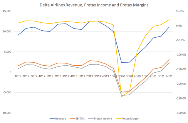 Comme vous pouvez le voir, je ne suppose pas que DAL retrouve ses revenus et son EBITDA aux niveaux d’avant la réforme de la Constitution avant la fin de 2021, le creux de la vague se produisant au deuxième trimestre de l’année 20.