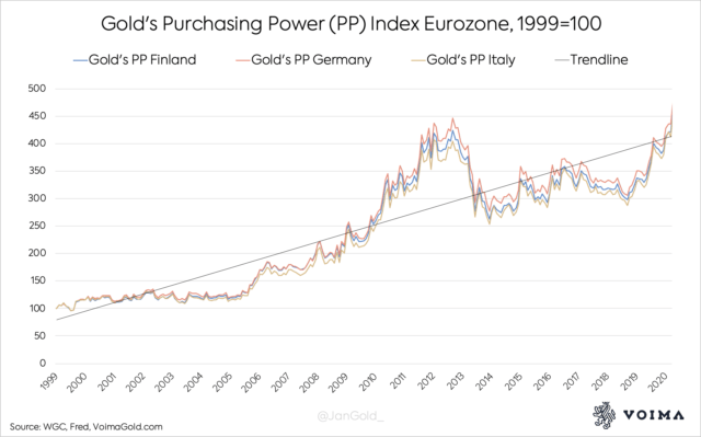 Il est intéressant de mesurer la valeur des monnaies les unes par rapport aux autres, mais le plus important est de savoir ce que cela signifie pour le pouvoir d’achat des monnaies au niveau local. L’objectif final de chaque participant à l’économie est de fournir des biens et des services. Ce qui compte vraiment pour une monnaie, c’est son pouvoir d’achat. Nous allons comparer le pouvoir d’achat des euros par rapport à celui de l’or dans la zone euro.