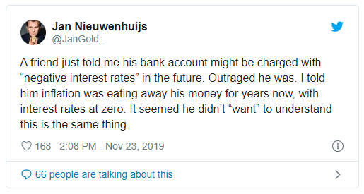 Beaucoup de gens pensent que les euros ne perdent leur pouvoir d’achat que lorsqu’une banque doit être payée pour stocker les euros. En d’autres termes, si le taux d’intérêt sur un compte bancaire est négatif. C’est ce qu’on appelle « l’illusion de l’argent ». En réalité, il faut soustraire l’inflation des prix à la consommation du taux d’intérêt pour arriver au taux d’intérêt réel. Par souci de simplicité, disons que le taux d’intérêt actuel pour la plupart des épargnants est de zéro, moins un pour cent d’inflation, soit -1%. Actuellement, les euros perdent environ 1 % de leur pouvoir d’achat par an.