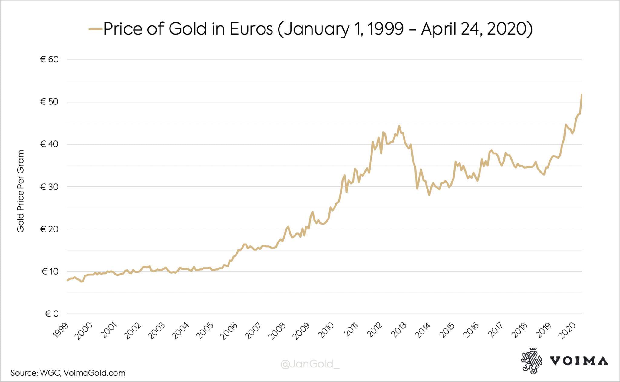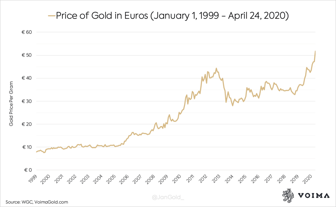 Le 23 avril 2020, le prix de l’or a franchi la barre des 51 000 euros par kg pour la première fois de l’histoire. Le prix de l’or en euros a augmenté de 555% depuis la création de l’euro en 1999. En d’autres termes, depuis sa création, l’euro a perdu 85 % de sa valeur par rapport à l’or.