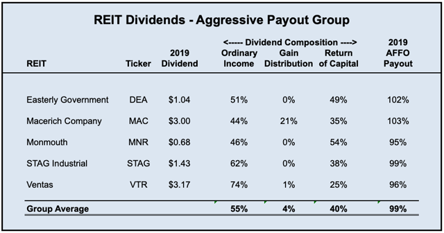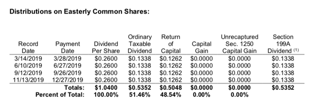 Chaque année, les sociétés de placement immobilier publient une analyse de leurs versements trimestriels de dividendes à des fins fiscales. Les paiements de dividendes sont répartis entre trois tranches : le revenu ordinaire, le revenu des plus-values et le remboursement du capital. Un exemple de la divulgation fiscale de Easterly Government Properties (DEA) 2019 est présenté ci-dessous.
