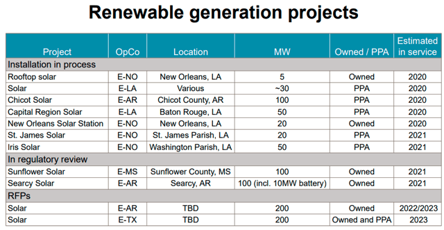 Entergy dispose également d’une solide réserve de projets de développement de production d’énergie renouvelable. Comme le montre le tableau ci-dessous, la société a environ 275 MW de projets d’énergies renouvelables actuellement en cours de développement, 200 MW de projets en attente d’une approbation réglementaire et 400 MW de projets en cours d’appel d’offres.