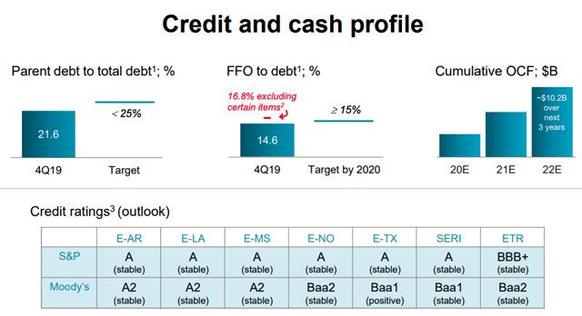 Entergy a un bilan de qualité avec des notations de crédit de Baa2 stable (Moody’s) et BBB+ stable (S&P). Son ratio fonds de roulement / dette est de 16,8 %, à l’exclusion d’un gibe-back de 300 millions de dollars et de certains éléments liés à sa sortie du segment CEE (son activité nucléaire). Le bilan d’Entergy, de qualité investissement, devrait permettre de soutenir ses projets de développement et d’accroître ses bénéfices et ses dividendes. En fait, la direction ne prévoit pas la nécessité d’émettre des actions en 2020 pour financer ses projets d’investissement. L’entreprise prévoit de financer ses projets en 2020 par une combinaison d’émission de dette et de fonds d’exploitation.