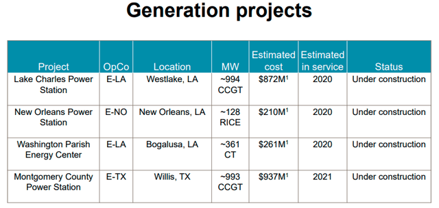 Entergy a actuellement un projet d’investissement de 12 milliards de dollars sur trois ans pour soutenir la croissance de son BPA. Ces projets comprennent une combinaison de projets de production d’électricité conventionnelle et de projets d’énergie renouvelable. Comme le montre le tableau ci-dessous, Entergy dispose d’une liste de projets de production d’électricité conventionnelle. Ces projets ajouteront une capacité totale de 2 476 MW à son portefeuille.