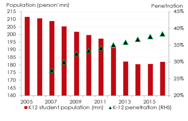 Selon une récente étude de marché réalisée par Frost & Sullivan, le marché chinois de l’enseignement extrascolaire de la maternelle à la 12e année était évalué à 51,8 milliards de dollars en 2016 et devrait atteindre 82,6 milliards de dollars d’ici 2021, avec un taux de croissance annuel moyen de 10 % entre 2016 et 2021.