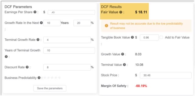 En supposant les généreux paramètres du DCF ci-dessus, les actions de l’entreprise seraient évaluées à environ 18 dollars par rapport au prix actuel de 30 dollars, ce qui indique qu’elles sont potentiellement surévaluées actuellement, compte tenu des hypothèses de bénéfices, de croissance et de taux d’actualisation du DCF.