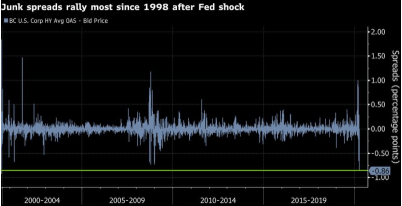 Mon prochain point concerne les mesures prises par la Fed, qui ont évidemment eu un large impact sur les marchés au cours des derniers mois. La volatilité ayant augmenté et les investisseurs ayant fui les actifs de toutes sortes, la Fed est intervenue pour annoncer des mesures de relance visant les obligations d’entreprises, les obligations municipales et les bons du Trésor de qualité. Lorsque cette mesure n’a pas réussi à endiguer les pertes du marché, la Fed a élargi son programme pour inclure ci-dessous-La Commission a également mis en place un crédit de qualité investissement, ce qui était une mesure sans précédent. Le résultat a été un gain immédiat pour les obligations à haut rendement de toutes les catégories, qui s’est étendu à des fonds comme HYG. En fait, le marché a vu les écarts de taux des obligations de pacotille se resserrer comme jamais auparavant en plus de vingt ans, comme on le verra plus loin :