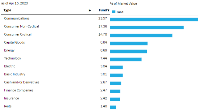En outre, le fait qu’un si grand nom ait récemment déclaré faillite n’est pas de bon augure pour le secteur des communications dans son ensemble. Bien que cela ne signifie pas nécessairement que cette tendance va se propager, si elle le fait, l’impact sur HYG sera disproportionné. En effet, le secteur des communications est le secteur le plus important du fonds en termes de pondération, comme le montre le graphique ci-dessous :