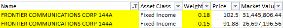 Dans l’ensemble, mon avis est négatif, bien sûr, mais il est particulièrement pertinent pour HYG pour deux raisons. Premièrement, le fonds détient des obligations FTR. Bien que les avoirs ne soient pas très importants, ils ne sont pas non plus négligeables, puisqu’ils représentent 0,33 % de l’actif total :