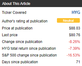 Tout d’abord, un peu sur HYG. Le fonds est géré par BlackRock (BLK) et son objectif est de « suivre les résultats d’investissement d’un indice composé d’obligations d’entreprises à haut rendement libellées en dollars américains ». Actuellement, le fonds se négocie à 80,76 $/action et son rendement actuel est de 5,38 %. J’ai réitéré une perspective neutre sur HYG en février dernier et, avec le recul, cela s’est avéré approprié. Le fonds a fourni une couverture raisonnable contre les actions dans l’intervalle, bien qu’il ait nettement baissé depuis cette révision :