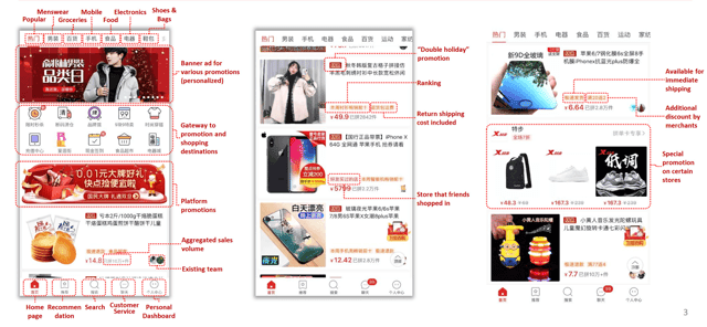 Contrairement aux autres plateformes, Pinduoduo et JingXi permettent aux utilisateurs de créer des « équipes » d’autres utilisateurs, d’amis ou de membres de la famille et d’acheter un article « en vrac » pour bénéficier d’une réduction. Pour Pinduoduo, les prix s’appliquent à la fois à l’achat individuel et à l’achat en équipe ; après qu’un achat en équipe a été initié et que les invitations ont été envoyées, l’achat doit être effectué dans les 24 heures pour bénéficier de la réduction d’équipe. Pour JingXi, les nouveaux utilisateurs se voient proposer des offres différentes pour 1¥ en faisant participer des amis à l’achat. Pour le Single’s Day, JingXi a proposé ces offres de 1¥ pour attirer des clients.