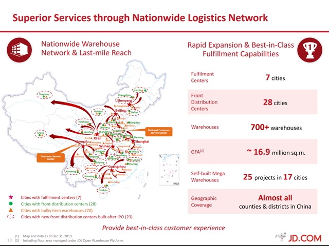 JD dispose d’une logistique supérieure, probablement la meilleure de sa catégorie, avec la capacité de livrer presque tous les produits le même jour ou le lendemain. Pour la dernière promotion de Single’s Day, « 90% des districts administratifs et des comtés de Chine ont atteint des vitesses de livraison le même jour ou le lendemain, le nombre de commandes traitées par les entrepôts automatisés a augmenté de 108% par rapport à l’année précédente, et 92% des commandes de première partie ont été livrées le même jour ou le lendemain ».