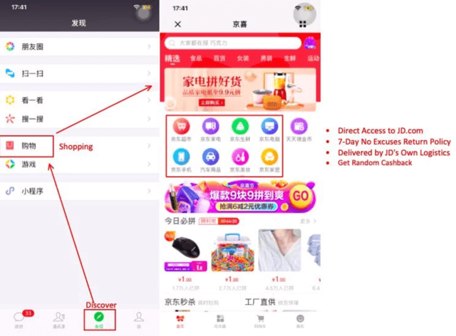 Pinduoduo et JingXi sont tous deux accessibles via le portail d’achat WeChat et les applications autonomes. L’interface d’ouverture affiche les promotions, les catégories et les offres du jour (¥1 RMB pour JD.com). L’image ci-dessous montre le lien entre WeChat et JingXi, et la façon dont la plateforme envisage l’ouverture.