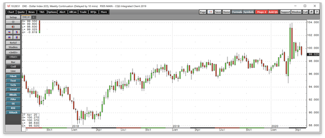 Le graphique hebdomadaire souligne la hausse de l’indice du dollar, qui est passé d’un creux de 88,15 en février 2018 à 99,815 à la mi-février 2020. Lorsque l’enfer a éclaté sur les marchés, les marchés des devises ont connu une volatilité massive des prix, l’indice se négociant entre 94,61 et 103,96, le plus haut niveau depuis 2002, de la semaine du 9 au 23 mars. Le dollar s’est stabilisé au niveau 100 au cours des dernières semaines, peut-être en raison d’une intervention significative du gouvernement dans l’arène monétaire.