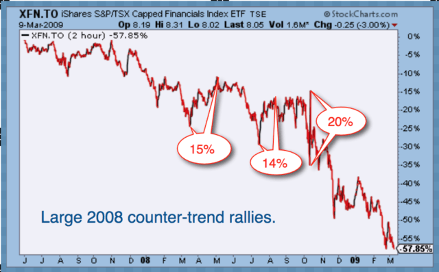 Malheureusement, l’impact risque d’être négatif. Comme le montre le graphique ci-dessous, la hausse de 15 % entre mars et mai 2008 n’est que l’une des trois hausses à contre-courant de la baisse globale de 57 % des valeurs financières canadiennes lors du dernier marché baissier. Chaque rallye a offert une autre sortie de secours d’un bâtiment en feu.