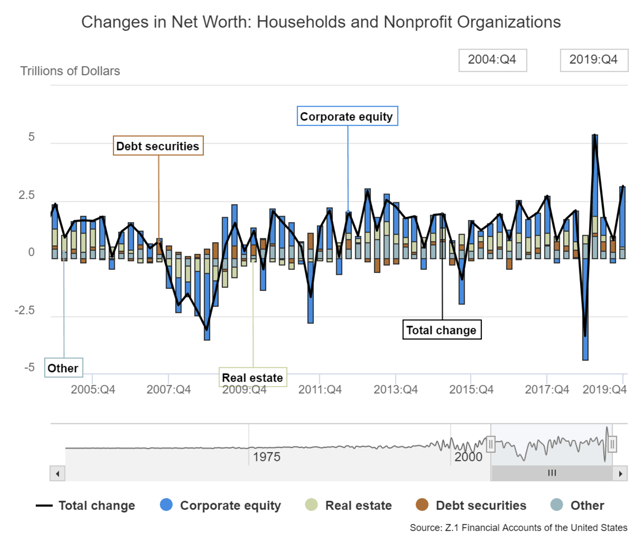 Dernier graphique – celui-ci du Conseil de la Réserve fédérale détaillant les composantes de la valeur nette des ménages et des organisations à but non lucratif. Bien entendu, il ne s’étend que jusqu’au quatrième trimestre de 2019.