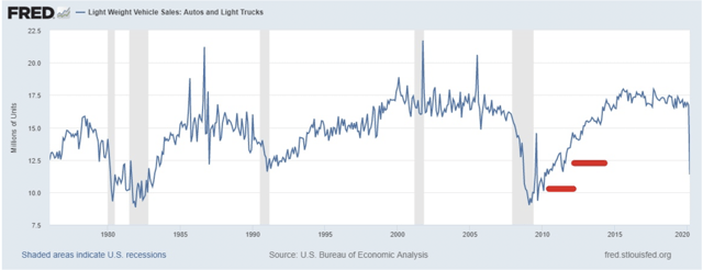 Poursuivons avec une série chronologique des ventes de voitures et de camions légers (dits de tourisme) et la façon dont elles ont réagi aux ralentissements passés. Les ventes de voitures particulières sont extrêmement sensibles aux ralentissements économiques – il s’agit d’un rare ménage qui, en période d’incertitude, ne peut pas reporter l’achat d’un nouveau véhicule d’un an ou deux :