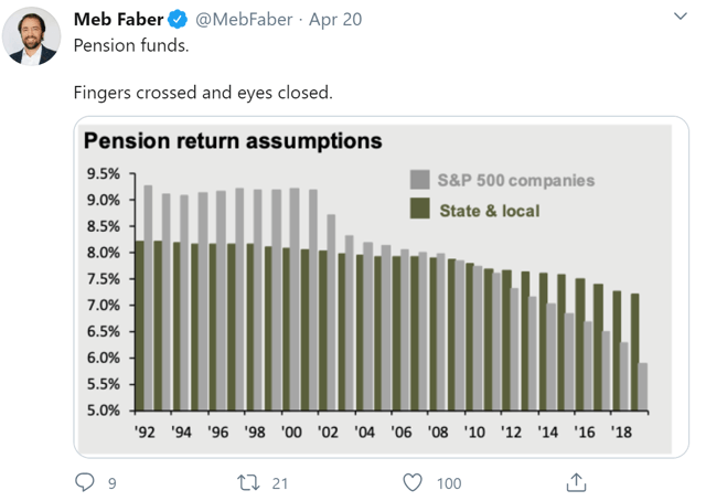 C’est peut-être une partie de la réponse. La Fed est probablement attentive au déficit de financement des pensions d’État, ainsi qu’à ses hypothèses de rendement à long terme. Comme vous pouvez le voir dans un tweet de Meb Faber ci-dessus, les pensions d’État et locales ont des hypothèses de rendement qui n’ont pas beaucoup baissé depuis les années 90. C’est au cours de cette période que les hypothèses de rendement des sociétés du S&P 500 ont chuté de manière drastique, et ce avant la récente débâcle des actions.