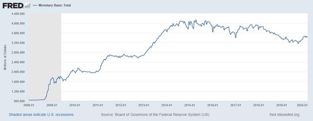 Les taux d’intérêt sont restés bas de 2010 à 2016. C’est l’une des meilleures croissances du PIB que nous ayons connues depuis des décennies, mais les taux d’intérêt sont restés accommodants. Et lorsqu’ils ont commencé à augmenter en 2018, ils ont à peine atteint 2,5 % avant que la bourse ne s’effondre en décembre. La base monétaire montre la même chose – même si elle est loin de resserrer une partie de la monnaie qui circule dans le système pendant les bonnes années. Et maintenant, ils dépensent comme des fous, en essayant d’empêcher l’économie de sombrer dans la dépression. Mais comme le Japon l’a montré, les rendements marginaux de l’excès de liquidités dans le système diminuent – la Fed sait qu’elle doit dépenser beaucoup plus maintenant pour avoir un effet bien moindre sur l’économie globale.