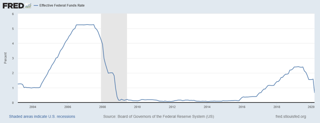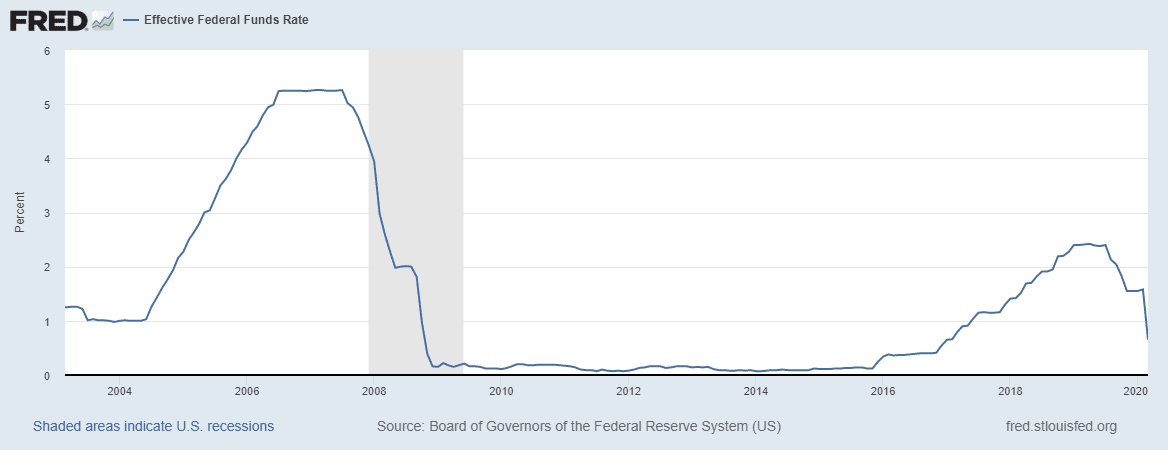 Au cours des deux dernières décennies, il y a eu plusieurs crises. L’effondrement du point.com. La Grande Récession. Et maintenant, la Récession des coronavirus. Une constante que nous avons eue, et heureusement je pourrais ajouter, est une Réserve fédérale accommodante tout au long de ces crises. Comme je l’ai mentionné dans le rapport Lead-Lag, même si j’ai critiqué la Fed, je ne suis en aucun cas anti-Fed. Dans des moments comme celui-ci, surtout en cas de crise où l’économie est fermée pour un événement extérieur, il est extrêmement positif d’avoir une monnaie fiduciaire que vous pouvez créer pour permettre les flux de liquidités et maintenir le système en marche. Mais comme vous l’avez probablement compris, je suis contre une Fed qui outrepasse ses pouvoirs, par exemple en achetant des ETF d’obligations de pacotille, transformant ainsi une dette risquée en une dette garantie par le gouvernement. De plus, en période de prospérité, la Fed est censée retirer son pied de l’accélérateur, afin d’avoir une grande capacité de réaction dans une crise comme celle que nous traversons. Avant la fermeture, l’ont-ils fait ? Examinons les taux d’intérêt depuis la dernière récession qui a conduit à cette crise, ainsi que la base monétaire :