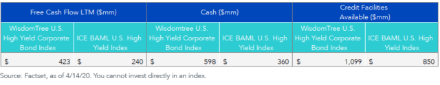 L’émetteur médian de la stratégie sous-jacente de WisdomTree dispose de 598 millions de dollars de liquidités, contre 360 millions de dollars sur le vaste marché américain des obligations à haut rendement. Enfin, considérons l’accès aux liquidités par le biais de facilités de crédit. L’émetteur médian du WisdomTree U.S. High Yield Corporate Bond Index a accès à près de 1,1 milliard de dollars, contre 850 millions de dollars pour l’émetteur public médian du ICE BAML U.S. High Yield Bond Index.