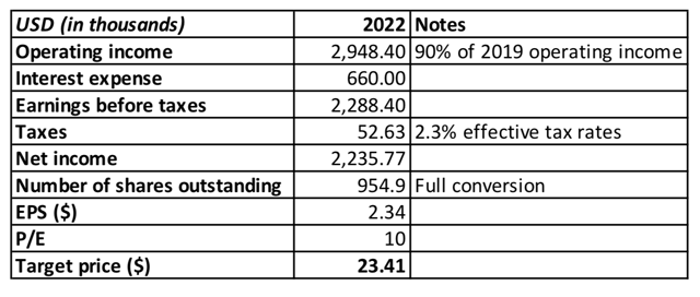 Nous supposons qu’en 2022, la pandémie de COVID-19 sera derrière nous et que tout rentrera dans l’ordre. D’ici là, le Carnaval générerait environ 90 % des revenus d’exploitation de 2019. Comme le cours actuel est déjà supérieur au prix de conversion de ses obligations convertibles de premier rang à 5,75 %, nous supposons que ces obligations convertibles seraient entièrement converties en actions ordinaires. En conséquence, le nombre total d’actions en circulation passerait à 954,9 millions d’actions. Au cours des cinq dernières années, le ratio C/B moyen de l’entreprise a été de 16 fois, mais nous utilisons de manière prudente un ratio de 10 fois seulement.