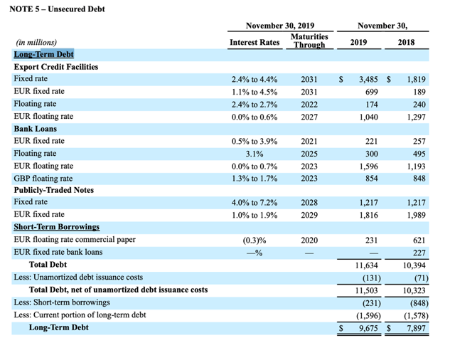 Carnival a utilisé un levier raisonnable dans son bilan. En février 2020, Carnival avait environ 1 milliard de dollars de dettes à court terme, 2,2 milliards de dollars de dettes à long terme à court terme et 9,74 milliards de dollars de dettes à long terme, tandis que ses capitaux propres s’élevaient à 24,29 milliards de dollars. Ainsi, le ratio dette financière/fonds propres était à un niveau raisonnable de 0,57x. Son encaisse de 1,34 milliard de dollars a plus que compensé la dette à court terme. En outre, les échéances de la dette à long terme s’échelonnent de 2020 à 2031.