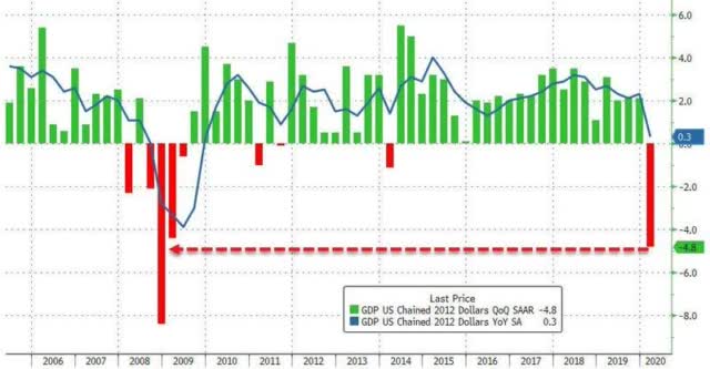 Le PIB américain a plongé au premier trimestre dans une situation profondément négative, mais le PIB réel se serait effondré encore plus durement sans les révisions des données du BEA. Selon le Bureau of Economic Analysis (BEA), l’économie américaine s’est contractée de 4,8 % par an au cours du trimestre de mars.