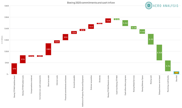 Au total, cela laisserait à Boeing une pénurie d’au moins 2,4 milliards de dollars. Donc, Boeing dépend vraiment d’une combinaison d’emprunts et de forts volumes de livraison. Ainsi, les dispositions actuelles et les plans précédents pour 2020 sont à peine suffisants pour Boeing, et ce après qu’il ait pleinement utilisé son prêt à terme à tirage différé, la facilité de crédit et les liquidités dont il dispose.