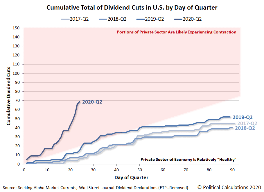 Le graphique suivant compare le rythme actuel des réductions de dividendes au cours du deuxième trimestre de 2020 au même trimestre des années 2017, 2018 et 2019, ce qui correspond à la bourse équivalente à ces graphiques de surmortalité illustrant l’impact total de la pandémie de coronavirus COVID-19.