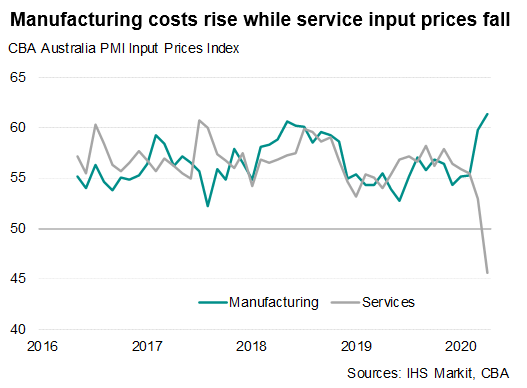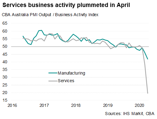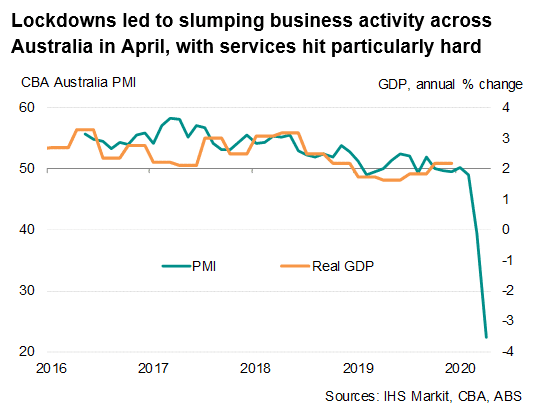Le gouvernement australien ayant annoncé que les restrictions sur les principaux services de santé et d’éducation seront levées à partir de la semaine prochaine, mais que d’autres mesures de distanciation sociale resteront probablement en place, l’activité économique devrait rester freinée dans les mois à venir. Alors que l’activité des services pourrait rebondir lorsque les mesures de distanciation seront assouplies, les fabricants semblent anticiper un ralentissement plus prolongé.